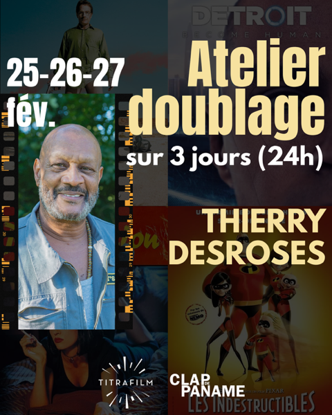 Stage apprentissage au doublage avec Thierry Desroses les 25, 26 et 27 février sur un total de 24h de formation.